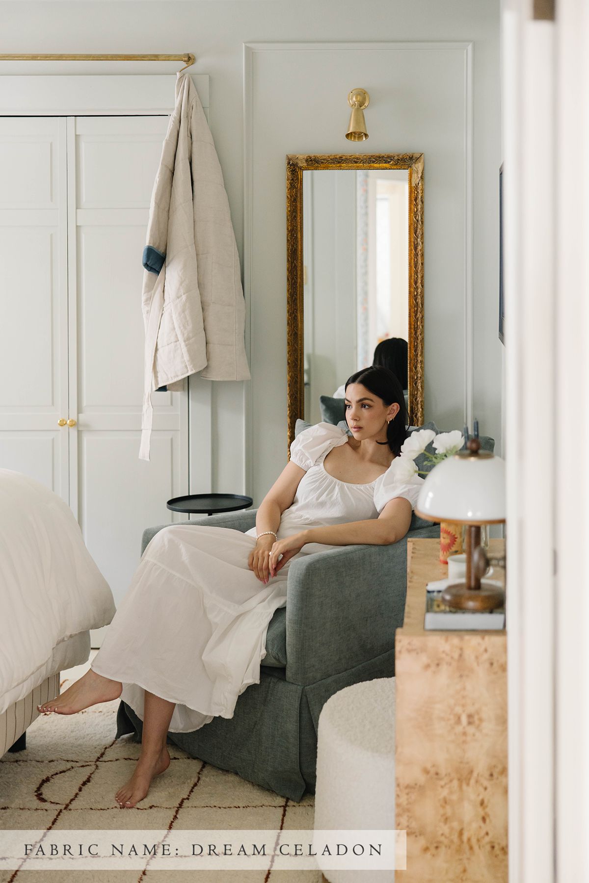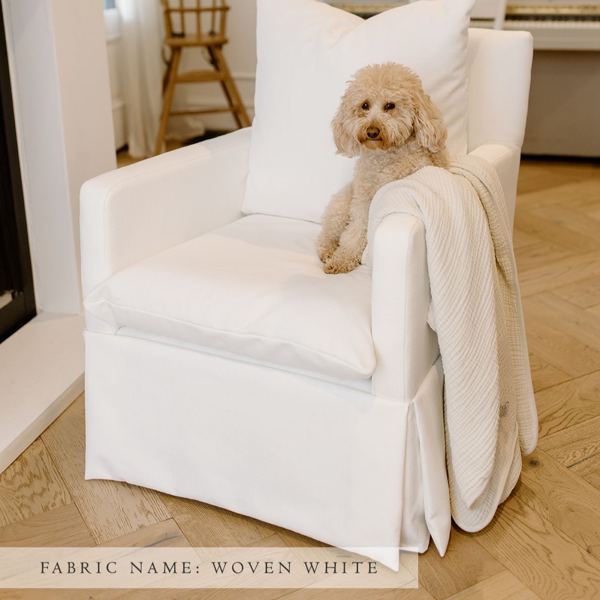 The Zoey glider features a skirted glider base, with removable down cushions that allow you to sink into the chair to find your perfect spot. Embrace style, comfort, and sophistication!