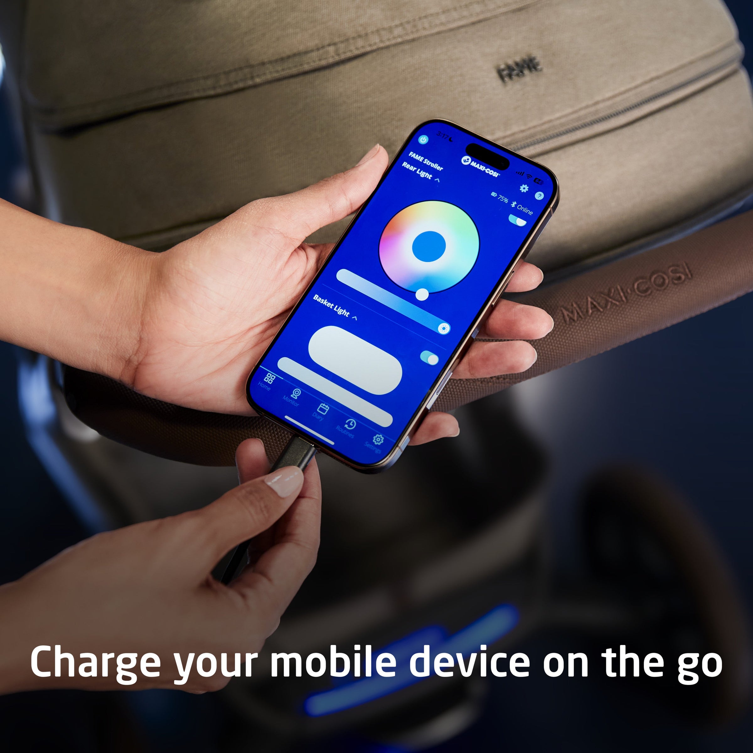 This innovative stroller is equipped with the Maxi-Cosi LumiRide system––integrated LED lights on the frame and storage basket that illuminate dimly lit pathways so you can see where you’re going, and others can see you. Use the Connected Family app to control and adjust the lights, including color and brightness. Because convenience and accessibility are important, you can charge your mobile device on the go with the easy-to-access USB-C port.